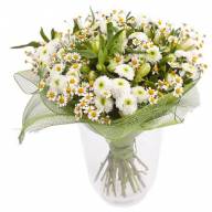 Изысканный и скромный букет из полевых цветов, отличный способ пожелать любимому человеку доброе утро или просто напомнить о беззаботных летних днях. Белые хризантемы гармонируют с ромашками как по смыслу, так и по форме – оба цветка символизируют скромность и нежную любовь, дружбу. Удачно дополняют этот ансамбль альстромерии и зелень. Букет несет в себе энергетику бодрости и умиротворения.